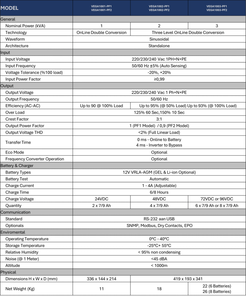 Designed for 1–3kVA single-phase input/single-phase output applications, the VEGA 1000 series adopts a true on-line double conversion (VFI) topology, integrating the latest three-level inverter architecture for exceptional efficiency and performance.